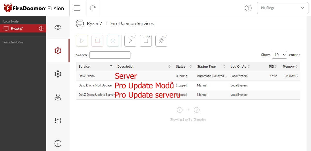 - Poté přes FireDaemona spusť požadovanou funkci Update Server nebo Update Mod